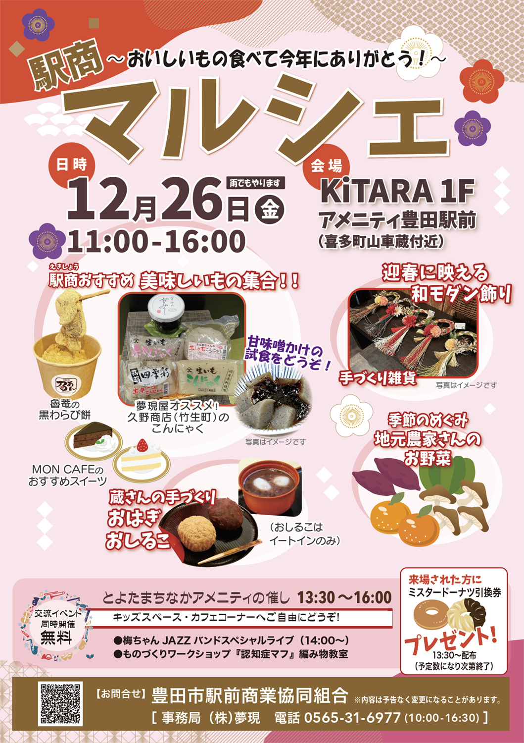 ◆とき:2025年12月26日金曜日11:00~16:00 ◆場所:豊田市喜多町2-170 KiTARA1階アメニティ豊田駅前(喜多町山車蔵付近)